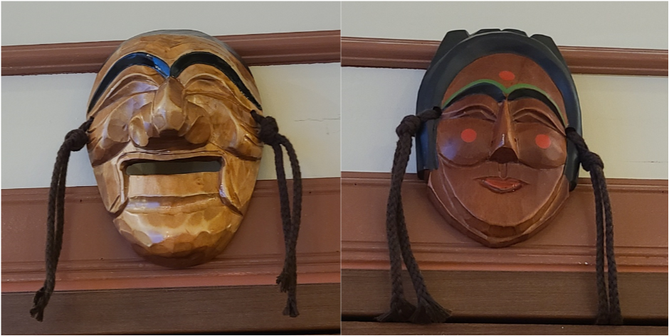 또 재미있는 포인트로 화장실위에 하회탈이 걸려 있는데요. 하회탈 모양으로 여자 남자 구분을 하고 있어 재미있다는 느낌을 받았습니다.