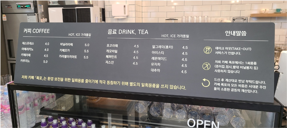 가격은 다른 카페와 크게 다르지 않았고요. 단지 일회용품을 사용하지 않아 테이크 아웃은 불가입니다.